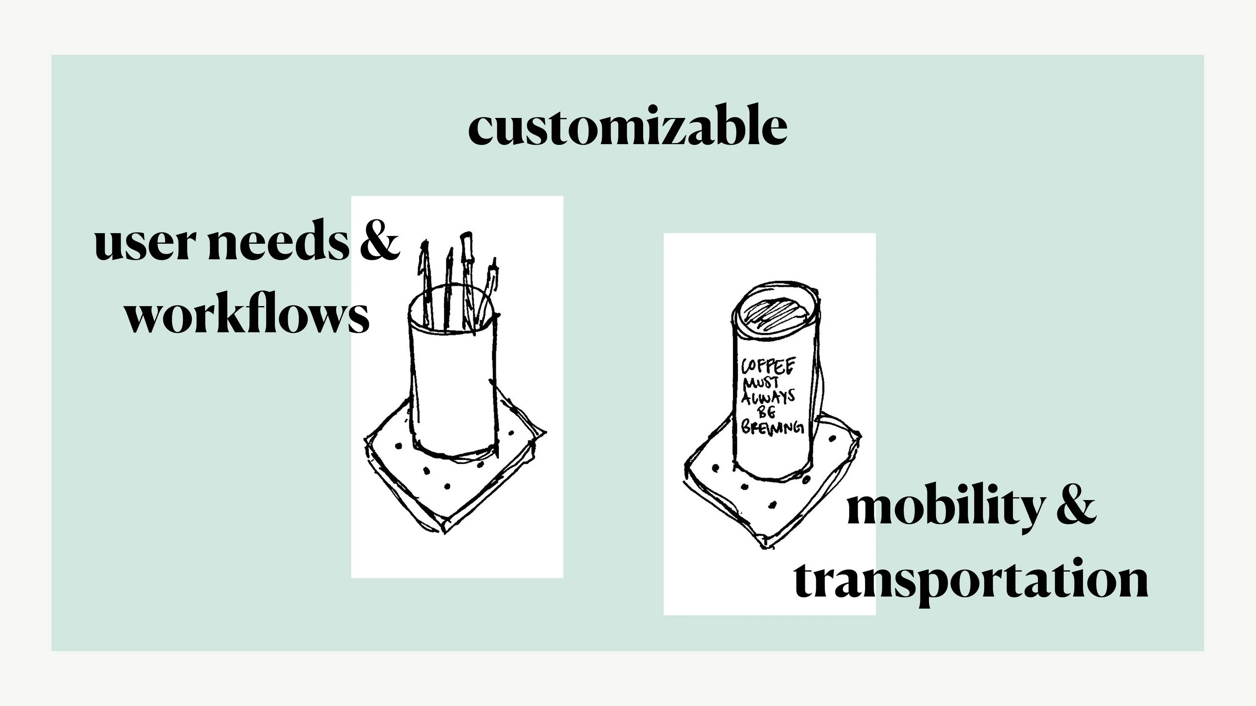 I developed three value-based design concepts in response for research findings: (1) a mobile mug for beverages integrating electronic features; (2) a desk helper combining multiple organizational tools in a modular form; and (3) a laptop case with storage compartments stocked with ergonomic tools. Based on design-team dot-voting, I moved forward with the Desk Helper concept for subsequent design development, prototyping, and evaluation.