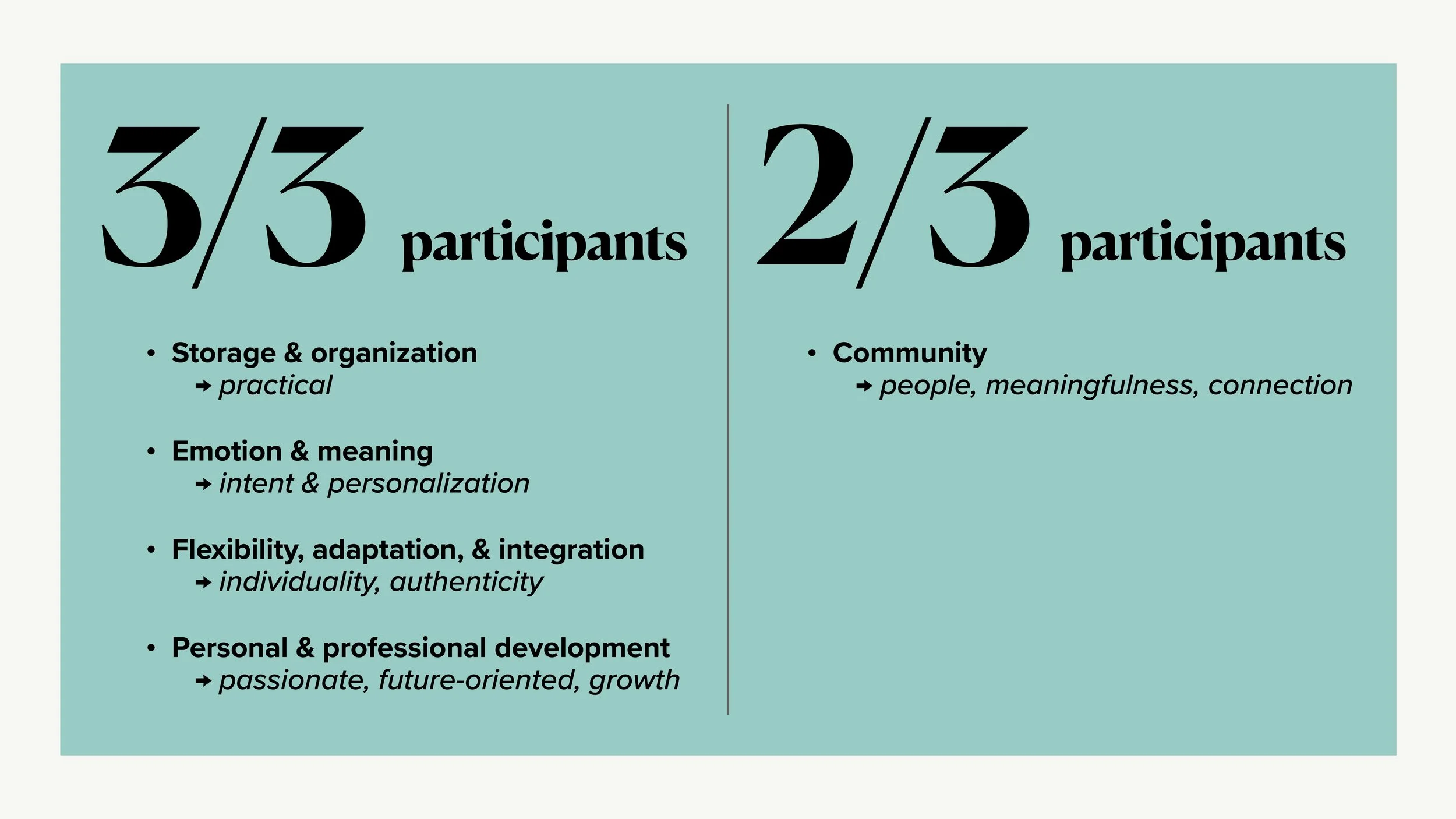The synthesis of the user evaluation session data revealed consistent patterns in Kano categories, as well as themes in user needs and values specific to the proposed design concept:
