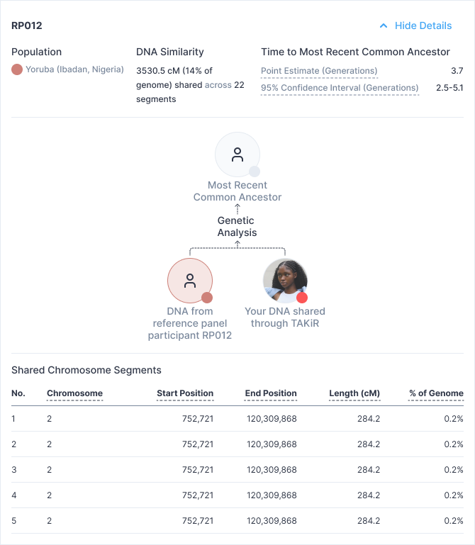 A significant challenge was designing data visualizations that emphasized genetic relationships without reinforcing racial constructs. Existing tools such as Ancestry.com and 23andMe have documentation on this topic, but it is not always accessible to the average user given its technical nature. Since the display of users’ genetic genealogy results would constitute the core of our platform, we began collaborating with the TAKiR research team in co-design sessions early on, in order to develop multiple iterations of our data visualizations. We focused the designs on emphasizing individual and familial connections, paired with clear, scientifically accurate language about ancestry and reference populations.